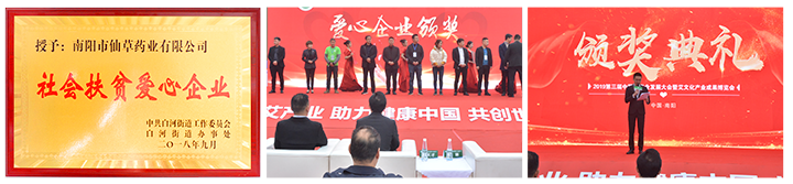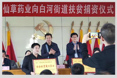 公司為白河街道貧困戶捐助30萬元,做為股金入股企業(yè),年分紅利3萬元,由街道辦事處為貧困戶購買公益性崗位和做為貧困戶收益,為貧困戶提供更加有效的就業(yè)保障。提高貧困戶收入。2018年10月16日舉行隆重的授牌儀式,會(huì)上市領(lǐng)導(dǎo)對南陽仙草藥業(yè)有限公司的扶貧工作給予高度贊場和肯定,并鼓勵(lì)其他企業(yè)向仙草藥業(yè)學(xué)習(xí)。